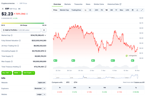 XRP(リップル)は、2ドル前半でのレンジ相場が続きました。2.10〜2.35ドル程度のレンジ内での上下となっており、大きな方向感はまだ出ていません。訴訟リスクが後退した一方で、新たな成長ストーリーが明確に意識される段階には至っていないと言えます。