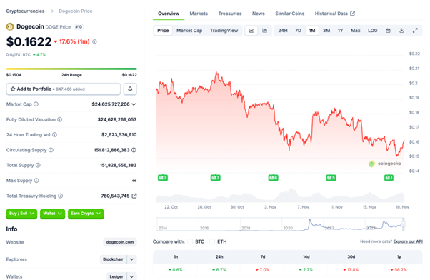 ドージコインは、0.15〜0.17ドル前後の限られたレンジ内での推移にとどまりました。短期筋による回転売買は続いているものの、目新しい材料に欠ける中で、ビットコインやソラナなど他銘柄の動きに連れた値動きが中心です。