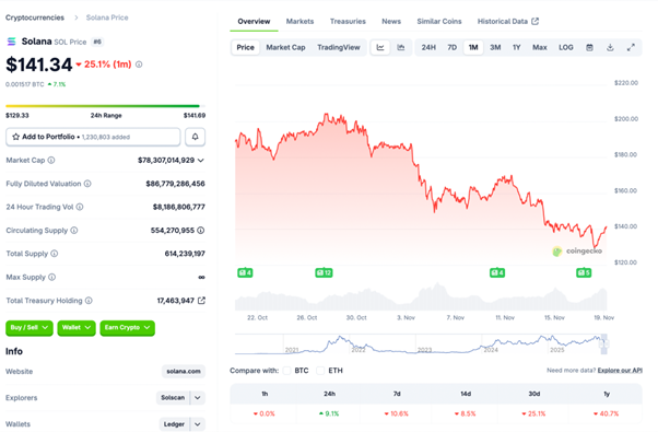 ソラナは、現物ソラナETFの上場を背景とした資金流入期待が続くなか、他の主要アルトと比較すると底堅い動きとなりました。水準としては140ドル前後での推移となり、135〜150ドルのレンジでの持ち合いが続いています。ETFを通じた機関投資家マネーの流入期待が、全般的なリスクオフムードの中でも相対的な下支え要因となっていると考えられます。