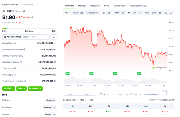 XRP(リップル)は12/18の1.8076ドルから、12/20に1.9574ドルまで上昇する局面があったものの、その後は1.90ドル前後へ収れんしました。12/23は1.9047ドルと、週間では約+5.4%でした。