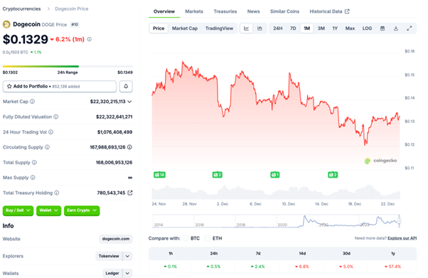 ドージコインは12/18の0.122058ドルから12/19に0.132219ドルへ急伸し、その後は0.13ドル台での小動きが中心です。