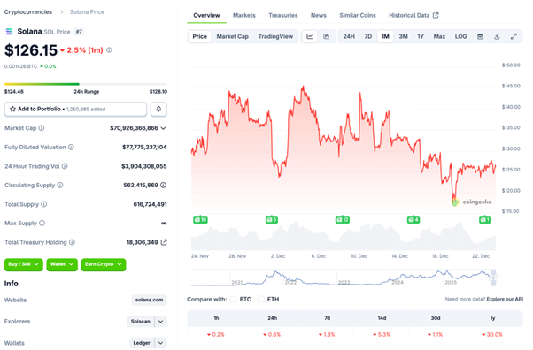ソラナは12/18の119.597ドルから反発し、同日に一時128.913ドルまで急伸。その後は125〜127ドル中心の持ち合いとなり、12/23は126.700ドル、週間では約+5.9%でした。