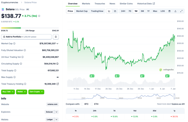 ソラナは、1/1終値の約126.9ドルから、1/6に高値約143.3ドルまで上昇し、1/7終値は約140.9ドル。週間では約+11.1%と堅調でした。週前半からの切り上げが比較的素直で、140ドル台の定着を試す動きが中心です。