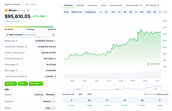 1/9 には米雇用統計が想定を下回ったとの報道があり、ビットコインが 9.1 万ドルを割り込む局面も見られました。しかしながら、1/13 公表の CPI は、ヘッドラインが前年同月比 2.7% 程度、コアが 2.6% 程度と報じられ、利下げ余地の見通しによりリスク選好を押し上げました。暗号資産も同日に大きく反発しています。