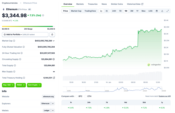 イーサリアムは 1/7 に下落が先行し、1/8 に 3,050 ドル台まで下押ししました。その後は 3,080〜3,120 ドル近辺で一度落ち着いた後、1/13 に +7% 超の上昇で 3,300 ドル台へ急回復し、1/14 も 3,320 ドル前後で推移しました。レンジとしては 約 3,060〜3,360 ドルが意識された週と言えます。