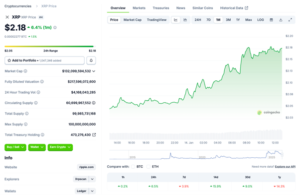 XRP(リップル) は週前半の下げが相対的に大きく、1/7 に -6%の下落を挟みつつも、その後は 2.0 ドル台前半を中心に値固め。1/13 のリスクオン局面では 2.18 ドル近辺まで戻したものの、週間では 概ね横ばいに近い推移となりました。