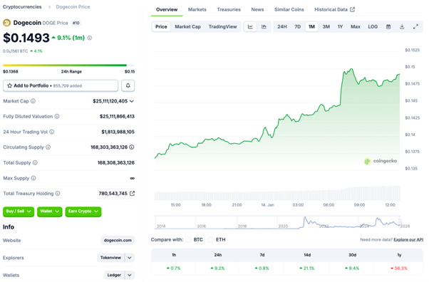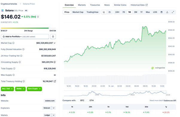 ソラナは 1/7 に下落した後も下値は限定的で、1/8 の 132 ドル台を底に切り返ししました。1/13 には 147 ドル台まで上昇し、1/14 も 146 ドル前後で高止まりしました。週間では +7% 前後と、主要銘柄の中でも相対的に強い部類です。