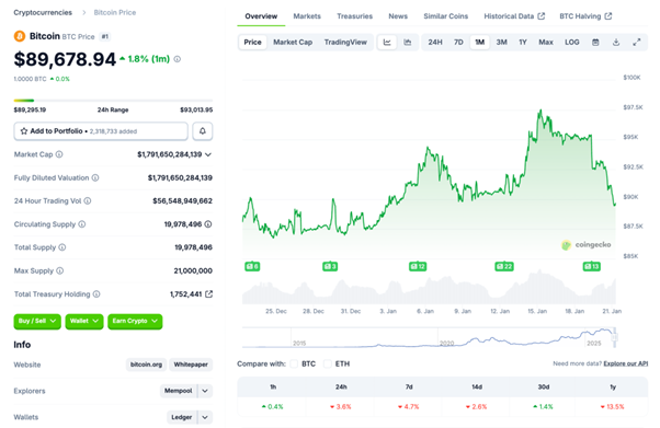 ビットコイン は1/15に 9.7 万ドル近辺まで上値を試したものの、その後は戻り売りが優勢となり、1/20 にかけて 8.9 万ドル台(安値 8.9 万ドル台)まで下落しました。週間レンジは概ね 8.9〜9.7 万ドル。
