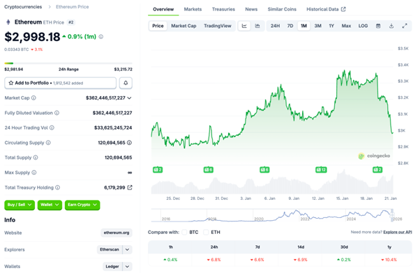 イーサリアム は 1/15 時点で 3,300 ドル台中心だったものの、週後半に下落が加速し、1/20 に 3,000 ドル近辺(安値 2,980 ドル台)まで押し込まれました。