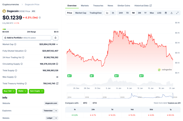ドージコイン は 1/15 に 0.14 ドル台から急落し、その後も軟調地合いが継続。1/20 には 0.12 ドル前半(安値 0.123 付近)まで下落しました。レンジは概ね 0.123〜0.147 ドルです。