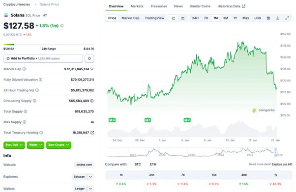 ソラナ は 1/15 に 146 ドル台まで上昇した後、1/20 に 127 ドル近辺(安値 126 ドル台)まで調整しました。レンジは概ね 126〜146 ドルです。
