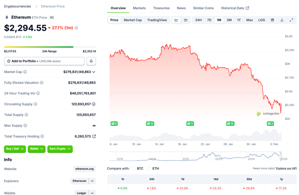 イーサリアムは週初(1/29)に3,000ドル近辺から2,800ドル台へ調整し、その後も下落圧力が継続。1/31に2,400ドル台、2/1にかけては2,200ドル台まで下押ししました。2/2〜2/3は反発と再調整が交錯し、執筆時点では2,200ドル台前半〜2,300ドル台中心の推移です。週間レンジは概ね3,000ドル台〜2,100ドル台と、ビットコイン以上に下落のインパクトが目立ちました。