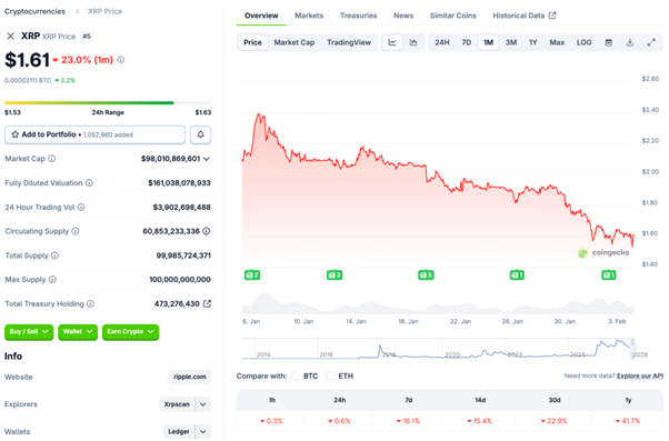 XRPは1/29に1.90ドル台を付けた後、1/31にかけて1.60ドル台へ急落し、安値は1.52ドル近辺まで下振れしました。2/2〜2/3は1.61ドル近辺へ戻す動きがみられる一方、上値追いは限定的で、週を通じて戻りの鈍さが残る推移となりました。