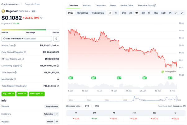 ドージコインは1/29に0.12ドル台前半から0.11ドル台へ急落し、1/31には0.10ドル近辺まで下押し(安値0.095ドル台)しました。その後は2/2〜2/3にかけて0.10ドル台後半へ持ち直し、短期資金の買い戻しが入る一方で、依然として高ベータらしい値幅の大きさが継続しています。