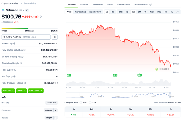 ソラナは1/29に125ドル台から117ドル台へ急落し、1/31には105ドル台まで下落(安値は98ドル台)しました。2/2は反発で104ドル台を回復したものの、2/3は再び100ドル近辺まで押し戻されました。週間レンジは概ね125ドル台〜96ドル台です。