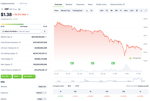 XRPも週初に急落しつつ、2/6に大きく切り返す動きとなりました。もっとも、反発は上値追いに繋がり切らず、1.4ドル台では利食い・戻り売りが優勢となりました。週間レンジは概ね1.12〜1.54ドルと、短期勢の需給で振らされやすい地合いが続きました。