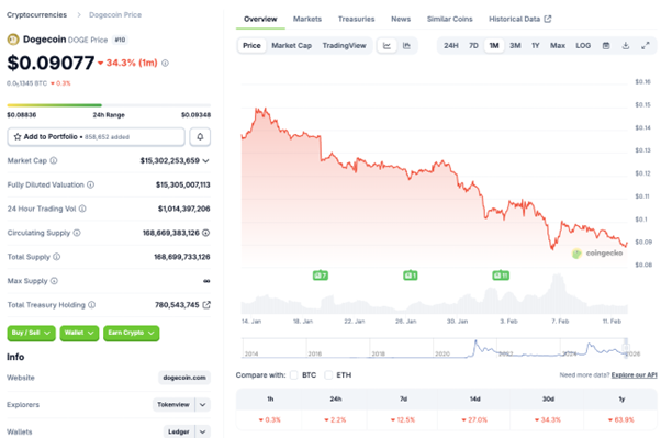 ドージコインは、週初の急落局面では下げが加速。2/6の急反発後も、反落時の下げが相対的に深く、戻り局面の粘りは限定的でした。