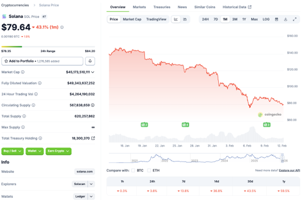 ソラナも2/5の急落が大きく、2/6に反発したものの、戻りの鈍さが目立ちました。週間レンジは概ね68〜93ドルで、週後半は80ドル近辺まで水準を切り下げて引けています。