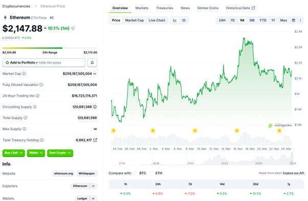 イーサリアムは一時2,300ドル台を回復したものの、2,390ドル近辺で明確に上値を抑えられ、足元では2,100ドル台前半を中心に不安定な推移です。ビットコイン比では戻りが鈍く、50日線近辺での戻り売り圧力が意識されています。需給面でも、3月20日には現物イーサリアム ETFから1.36億ドルの純流出が観測されており、価格の戻りの鈍さと整合的です。