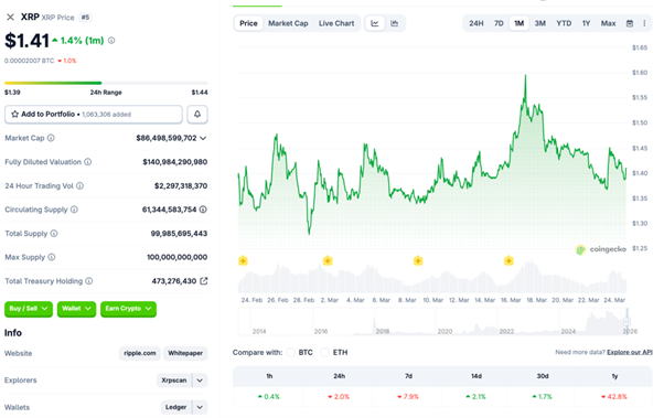 XRPは前週の1.61ドル近辺から調整基調が続き、3月20日時点では1.45ドル前後、週明けには1.36ドル台まで押した後、24日には1.40ドル台へ持ち直しました。ただし、ETF・デリバティブ需要の鈍さが意識されており、反発しても値幅は限定的です。相場全体がリスクオフに傾くと、XRPは中立圏の中でも戻り待ち売りを受けやすい状態にあります。