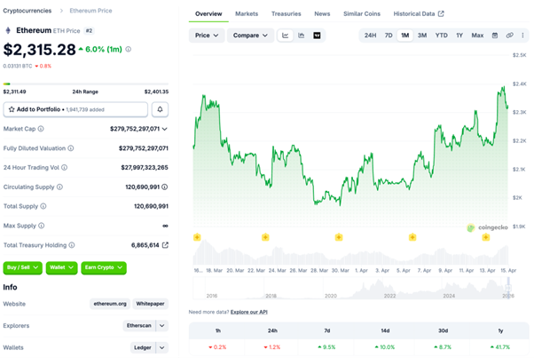 イーサリアムは4月8日に2,240ドル前後で始まり、9日には2,190ドル近辺へ調整したものの、その後は持ち直し、14日には2,370ドル台で取引を終了しました。週内レンジは概ね2,160〜2,390ドルで、週間では6%前後の上昇です。ビットコインに追随する展開でしたが、終盤は戻りの勢いがやや強く、主要アルトの中では相対的にしっかりした推移といえます。
