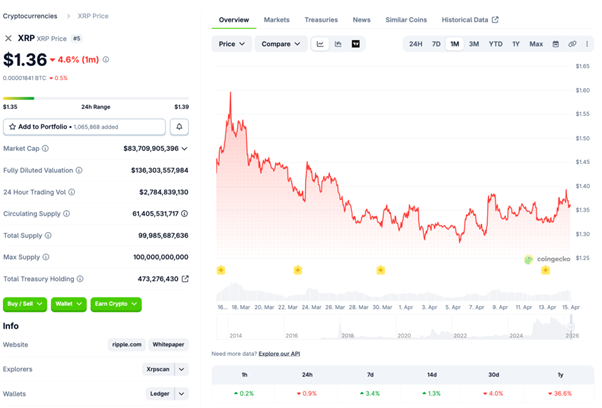 XRPは4月8日の1.38ドル前後から、9〜13日にかけて1.32〜1.36ドルでのもみ合いを続け、14日には再び1.38ドル近辺まで戻しました。週間の騰落としてはほぼ横ばいですが、1.32ドル台を割り込まずに往来した点は下値の安定を示しています。方向感はまだ限定的で、典型的なレンジ相場の色合いが強い週でした。