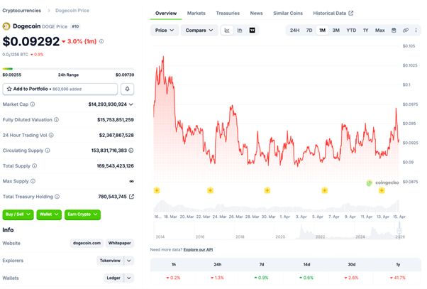 ドージコインは4月8日に0.0947ドル前後まで買われた後、12〜13日に0.090ドル台へ押し戻され、14日は0.094ドル前後へ持ち直しました。週全体では小幅安から横ばい圏で、値幅はあるものの、強い上昇トレンドに入ったとは言いにくい状況です。ミーム銘柄らしくセンチメントの影響を受けやすい一方、今週は高値追いよりも短期回転の売買が中心でした。