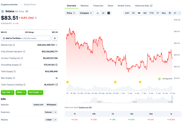 ソラナは4月8日に85.6ドル前後で始まり、週末にかけて81ドル台まで下押しする場面がありましたが、14日には86.5ドル前後まで回復しました。週間騰落は1%前後の小幅高にとどまるものの、81ドル台では押し目買いが入りやすく、下値を切り下げなかった点は悪くありません。ビットコインやイーサリアムほどの強さではないものの、崩れ切らない推移でした。