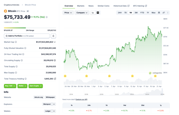 ビットコインは週前半から7.5万ドル前後で底堅く推移し、4月17日には中東情勢の緊張緩和期待を背景に7.6万〜7.8万ドル台まで上伸しました。その後は利益確定売りに押される場面もありましたが、4月21日午前時点では7.5万ドル台を維持しています。米FORTUNE誌の4月21日付データではビットコインは75,901ドル近辺、イーサリアムは2,305ドル近辺、XRPは1.43ドル近辺で推移しており、ビットコインは1カ月前比では上昇を保っています。