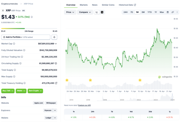 XRPは1.4ドル台を回復し、主要銘柄のなかでは相対的に底堅い値動きとなりました。OKXの4月21日時点データではXRPは1.41ドル台、過去7日ではプラス圏で推移しています。もっとも、1.50ドル台手前では売り圧力が意識され、価格はまだレンジ上限を明確に突破したとは言い切れません。Wrapped XRPのSolana対応など、ユースケース拡大を意識させる材料はあるものの、CoinSharesの週次データではXRP関連商品から資金流出が確認されており、現物価格の堅調さと機関投資家フローには温度差がみられます。