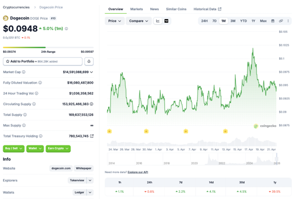 ドージコインは週前半に0.10ドル手前まで上昇し、ビットコインやイーサリアムが小幅な値動きにとどまる場面で、相対的に値幅を出しました。ただし、0.10ドルの心理的節目では戻り売りが出やすく、4月21日時点では0.094ドル台へ反落しています。Coinbaseのデータでは1ドージコインは0.0947ドル前後で、SNS上の関心は高いものの、価格面では0.10ドルの定着が次の課題です。