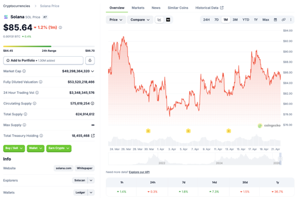 ソラナは85ドル前後で推移し、週半ばのリスクオン局面では買い戻しが入りましたが、90ドル台を回復するには至っていません。Investing.comの4月21日時点データではソラナは85ドル台、日中レンジは84〜86ドル台となっており、値動きは比較的落ち着いています。ビットコイン主導の相場ではソラナの反発も続きやすい一方、90ドル台に乗せられない場合は、再びレンジ下限を試す可能性があります。