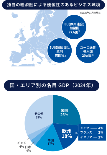 - 世界的なサプライチェーン見直しが進む環境で、統一通貨ユーロ導入国をはじめとした欧州経済圏は、域内で自由にビジネスを展開できる強みがあります。