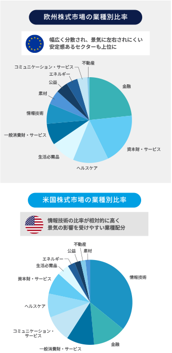 - 米国株とは業種のバランスが異なる欧州株への投資により、より安定感のある産業をカバーし、市場や景気の変動を吸収する効果が期待できます。