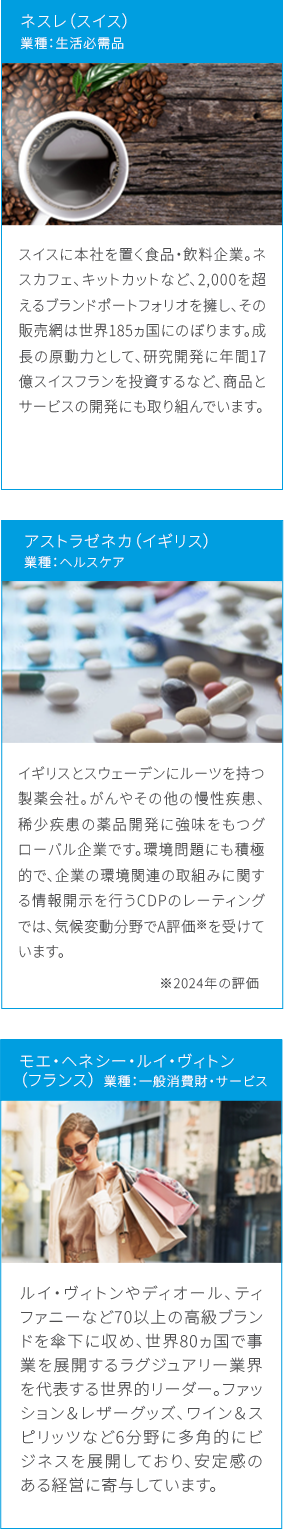 上記は、あくまでも理解を深めて頂くために例示したものであり、いかなる個別銘柄の売買等を推奨するものではありません。また、将来のファンドへの組入を示唆または保証するものではありません。
