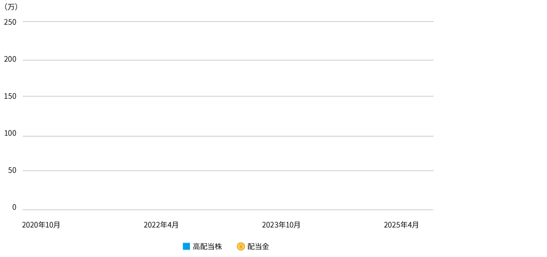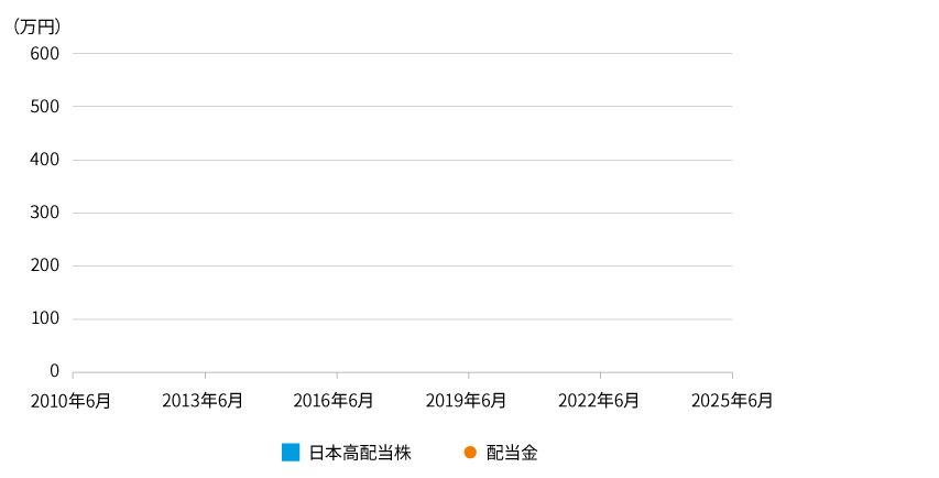 出所:日本経済新聞社等のデータを基に、アムンディ・ジャパン株式会社が作成。日本高配当株は日経累進高配当株指数(トータルリターン)。配当金は前月末の評価額と当月末の予想配当利回りから簡便的に算出。(税金は考慮しておりません。)評価額は前述の配当を控除のうえ算出。実際のファンドの分配方針とは異なりますのでご注意ください。2025年10月末現在の投資金額の評価額ならびに投資期間中の配当金合計は、1万円未満を切り捨てて表示。