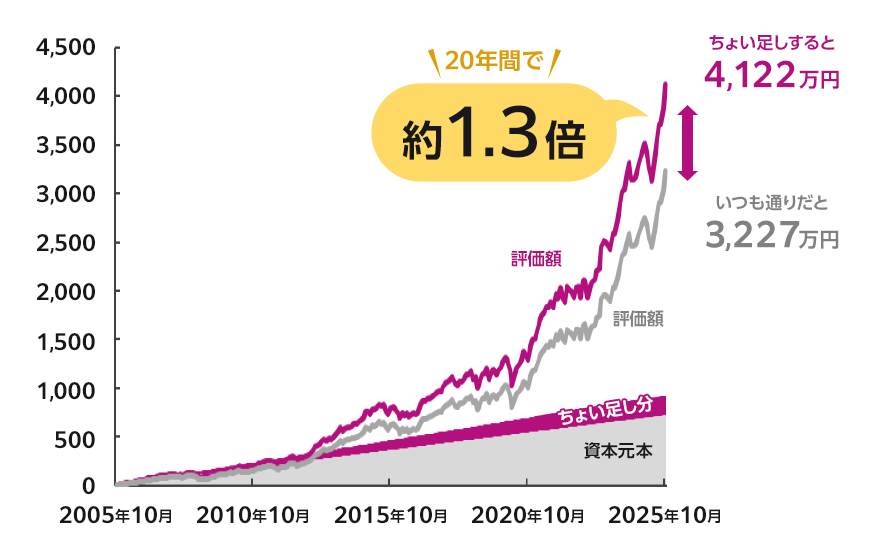 ちょい足し(ボーナス月(6月・12月)に5万円増額):投資元本920万円、評価額約4,122万円