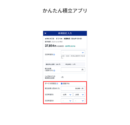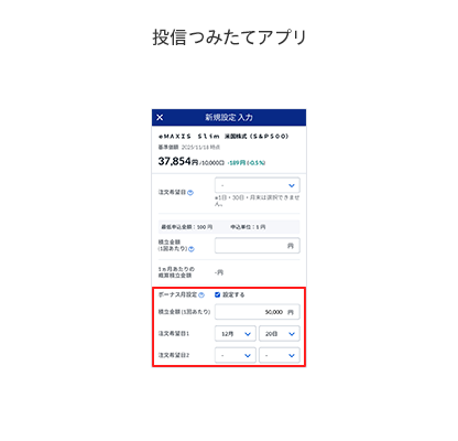 ・ボーナス月設定は通常の投資信託の積立設定に、年2回までボーナス月(増額月)を指定できる機能。NISA口座でもご利用が可能です。