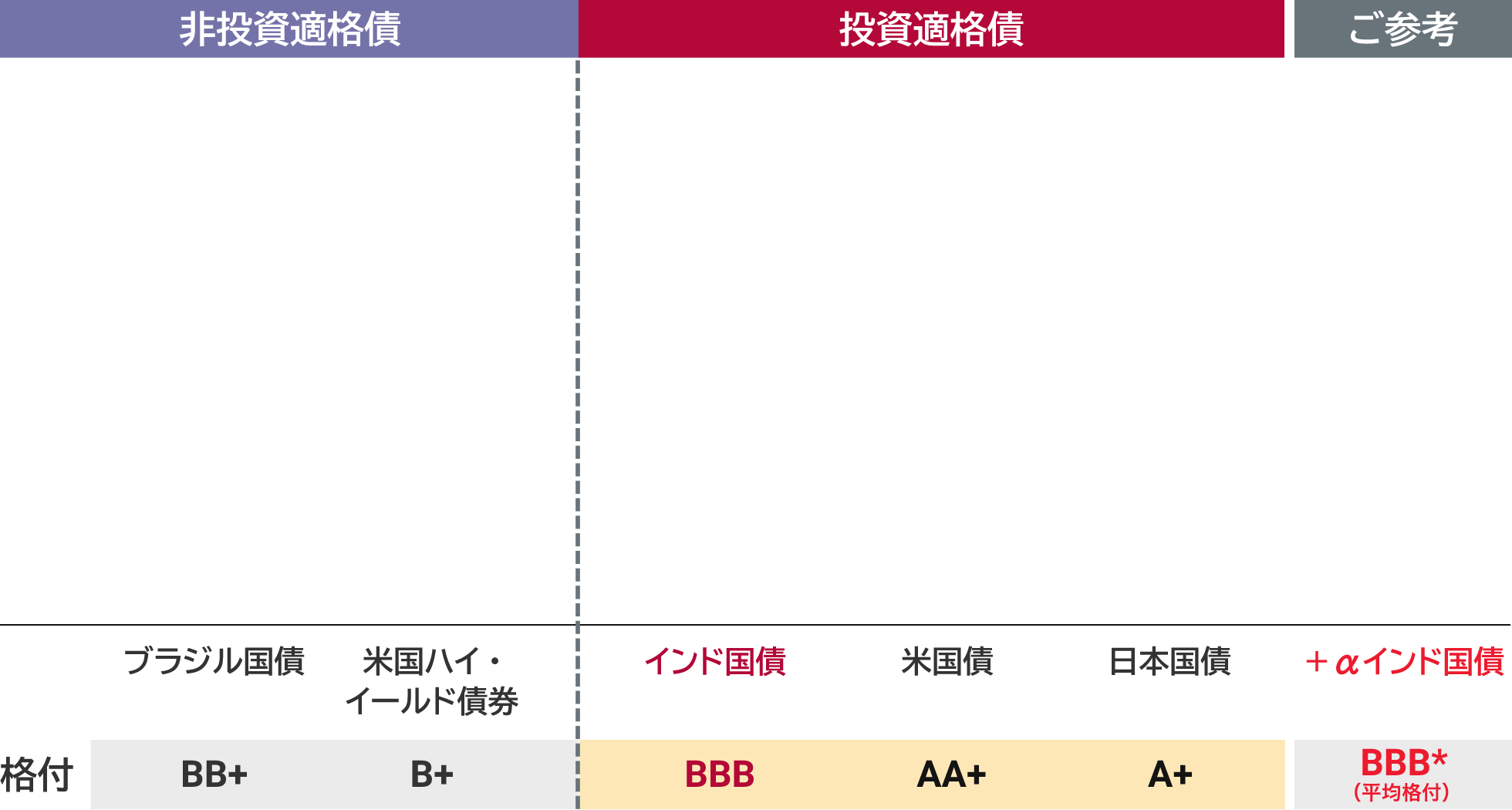 *+αインド国債の債券ポートフォリオの平均格付。平均格付は、S&Pおよびムーディーズの格付をもとに、イーストスプリング・インベストメンツが独自の基準に基づき加重平均して計算したものであり、イーストスプリング・インド国債ファンド(3ヵ月決算型)/ (年2回決算型)およびマザーファンドの投資信託証券にかかる信用格付ではありません。