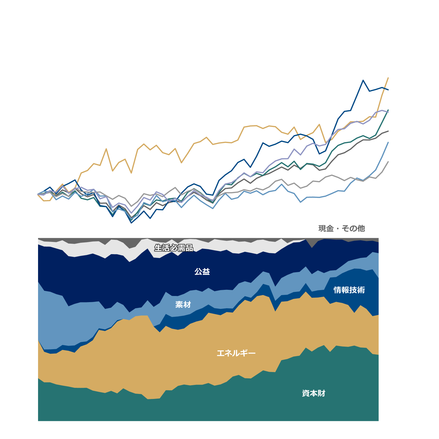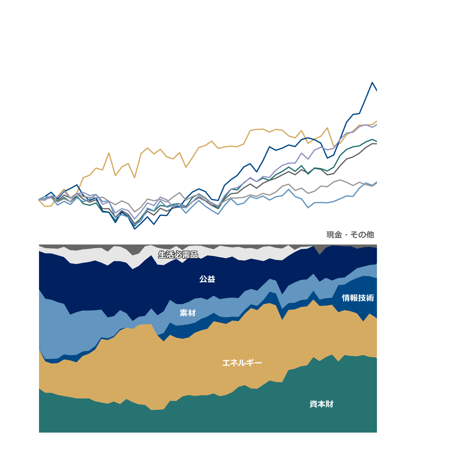 - 上段:MSCI ACWIセクター別トータルリターン推移