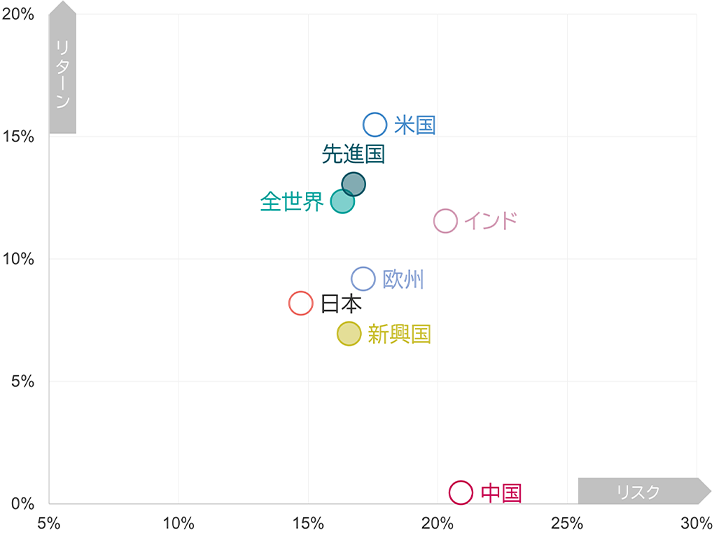 株価指数はすべて税引後配当込み、米ドルベースの値をアモーヴァ・アセットマネジメントが円換算。金先物:ブルームバーグ金サブ指数(エクセスリターンベース、米ドルベース)。金先物は米ドルで決済される先物取引を活用しますが、買建額に対する為替変動の影響がないことから米ドルベースを掲載しています。なお、実際の金先物取引では、評価損益分や外貨建て証拠金については為替変動の影響を受けます。上記指数は、当ファンドのベンチマークではありません。リターンは月次リターンの平均、リスクは月次リターンの標準偏差を、それぞれ年率換算。信頼できると判断した情報をもとにアモーヴァ・アセットマネジメントが作成。上記は過去のものであり、将来の運用成果等を約束するものではありません。