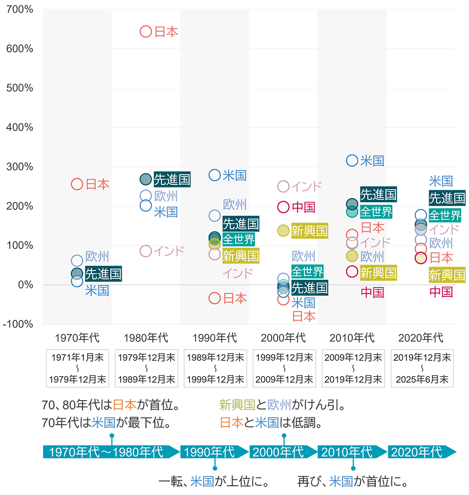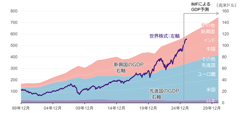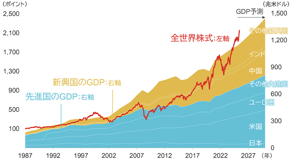 世界株式:MSCIオール・カントリー・ワールド・インデックス(税引後配当込み、米ドルベース)。上記指数は当ファンドのベンチマークではありません。IMF「World Economic Outlook, October 2025」および信頼できると判断したデータをもとにアモーヴァ・アセットマネジメントが作成。上記は過去のものおよび予測であり、将来の運用成果等を約束するものではありません。