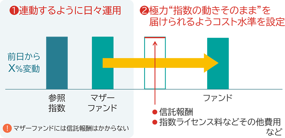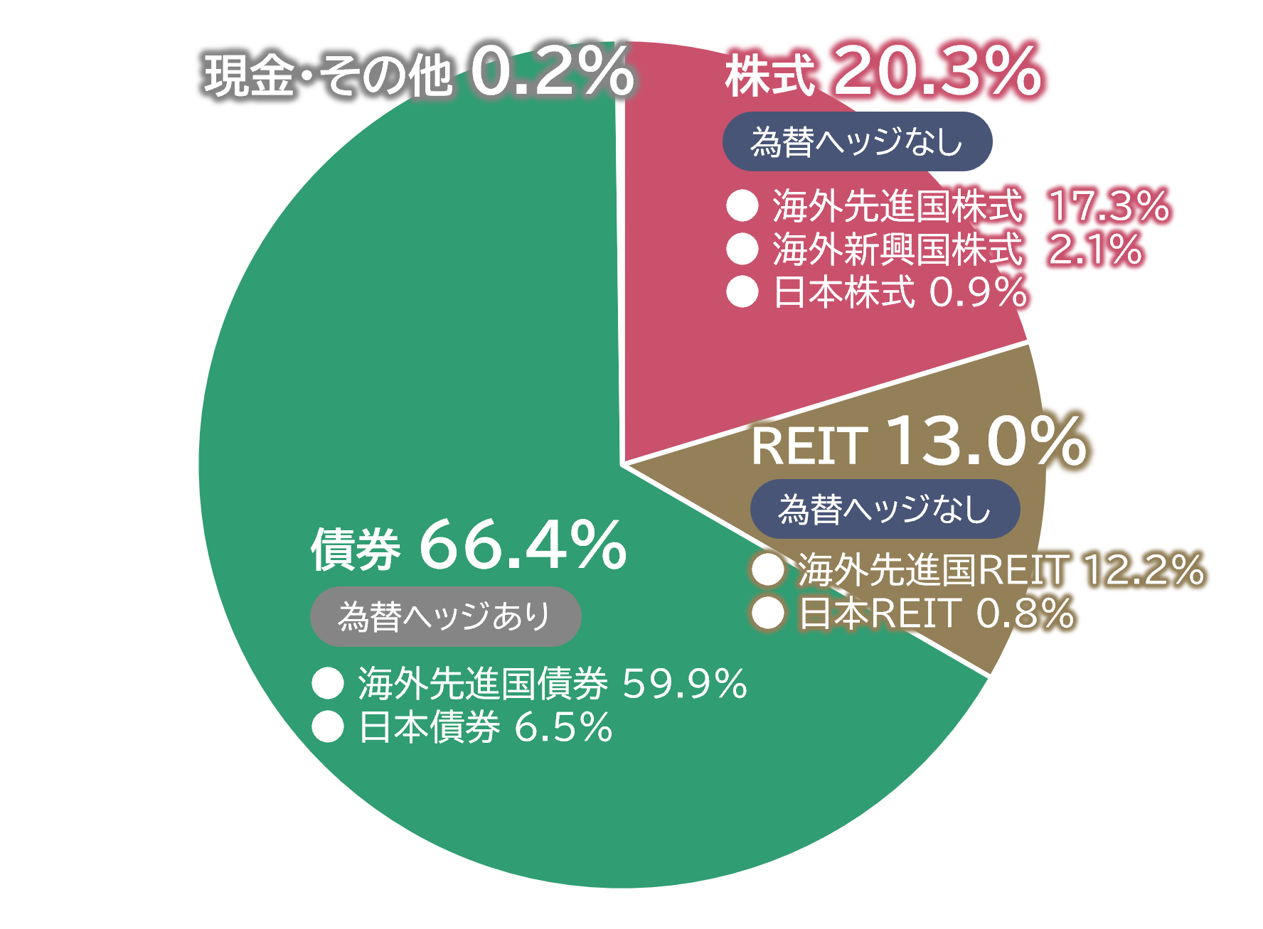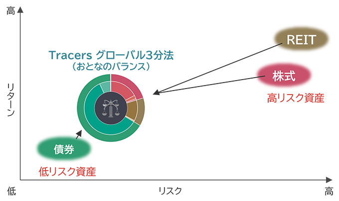 世界株式などの現物資産だけに投資するのではなく、株価指数先物や金先物も1本の投資信託の中で組み合わせる「投信ならでは」の仕組み で、各資産への100%相当額ずつの投資を実現します。