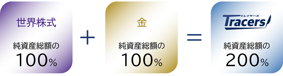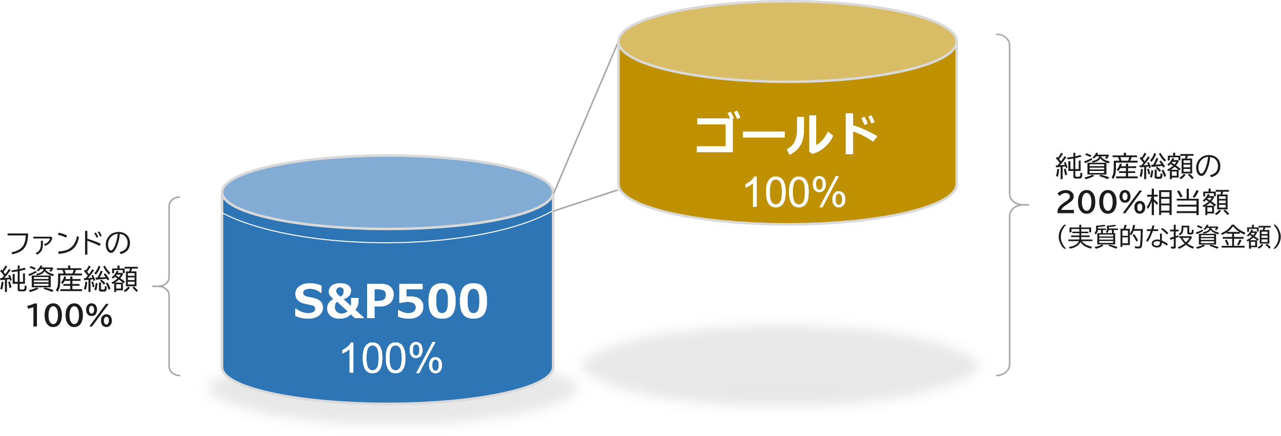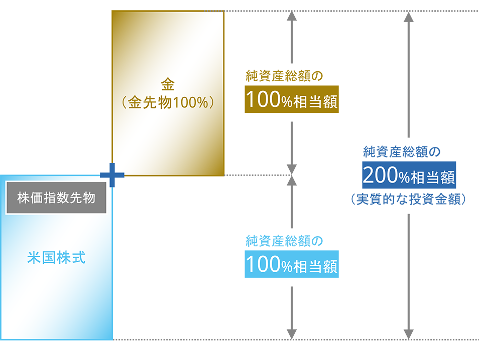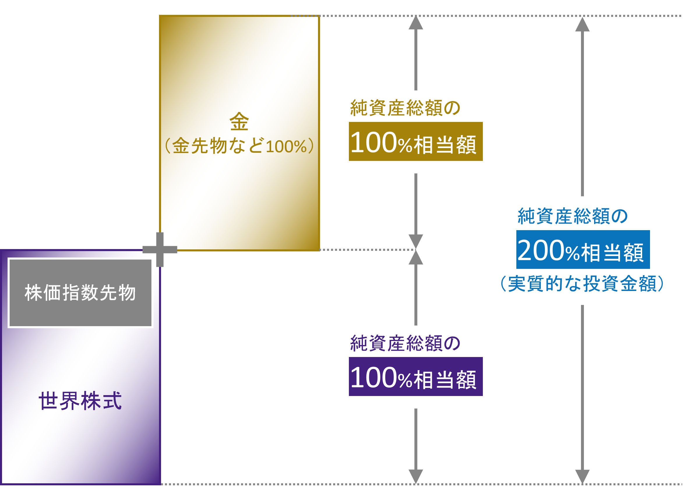当ファンドは、世界株式(海外先進国株式、海外新興国株式、日本株式)とゴールド(金)にそれぞれ純資産総額の100%相当額を投資し、合計200%相当額の投資ができる投資信託 です。