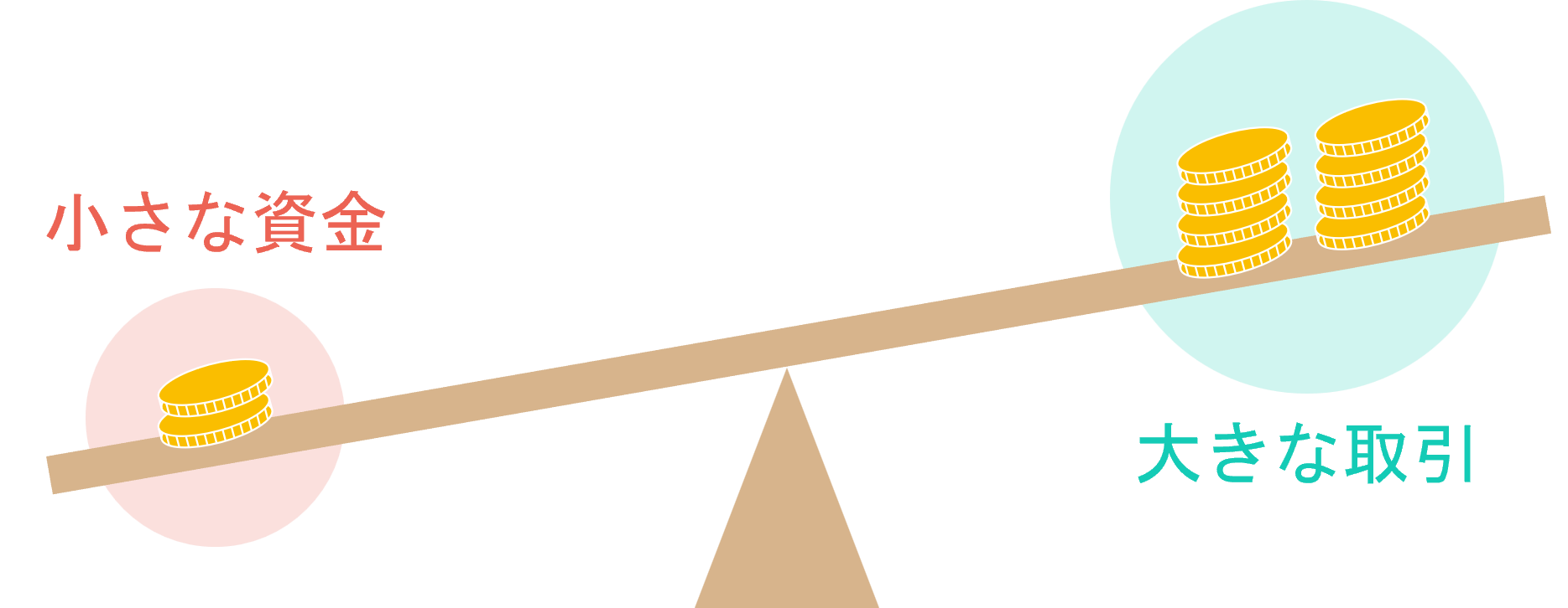 先物取引では、原則として損益が発生した際の差額のみをやり取りする「差金決済」が採用されています。これにより、少ない資金で大きな額の取引を行なうことができます。この小さな資金で大きな取引を行なうことを「レバレッジ」といいます。