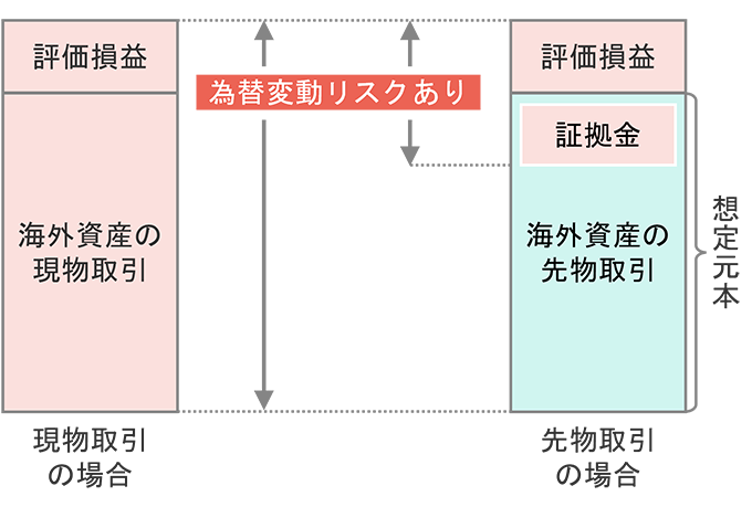 一方、先物取引の場合は「差金決済」となります。そのため、実質的に投資している株式など(想定元本)に対してではなく、主に「評価損益分」と担保として差し入れた現金「外貨建て証拠金」に為替変動の影響が限定されます。