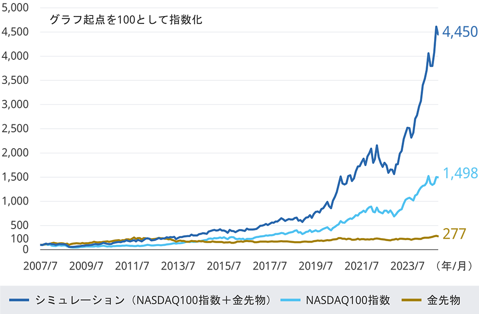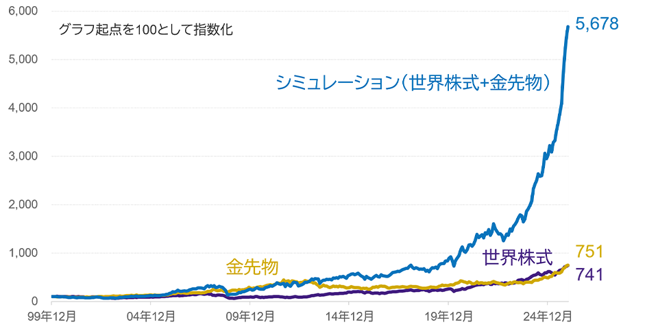 世界株式と金の組み合わせによる分散効果 に加え、レバレッジ効果 や長期投資による複利効果 などもリターンの向上に寄与したと考えられます。