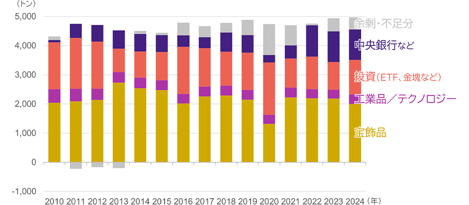 買取価格の高騰によって近年注目されることの多い宝飾品としてだけでなく、工業品や中央銀行の保有目的といった安定的な需要が、構造的な金価格の下支え要因になってきました。