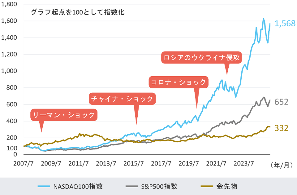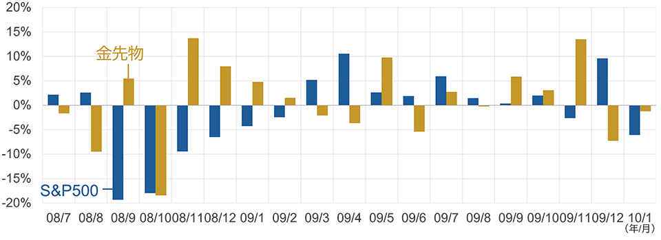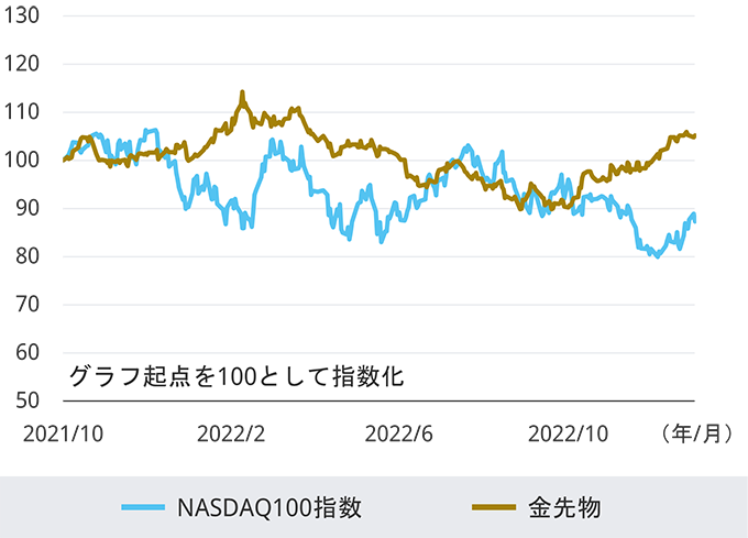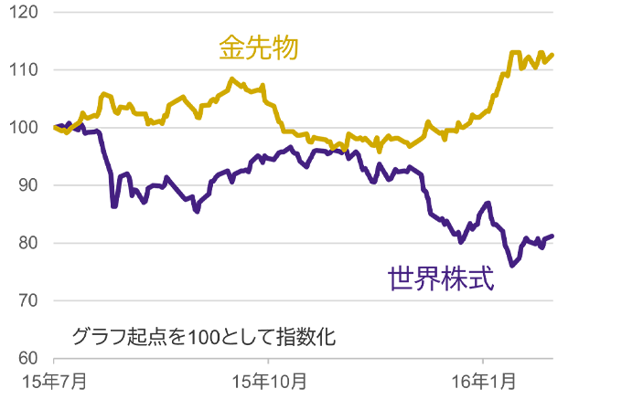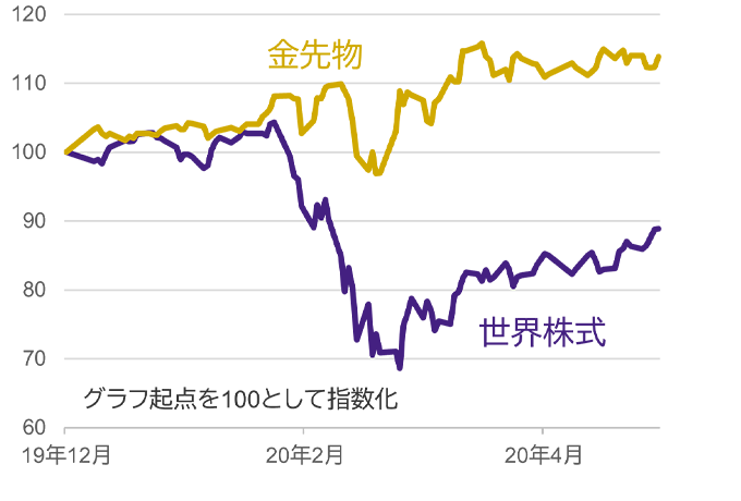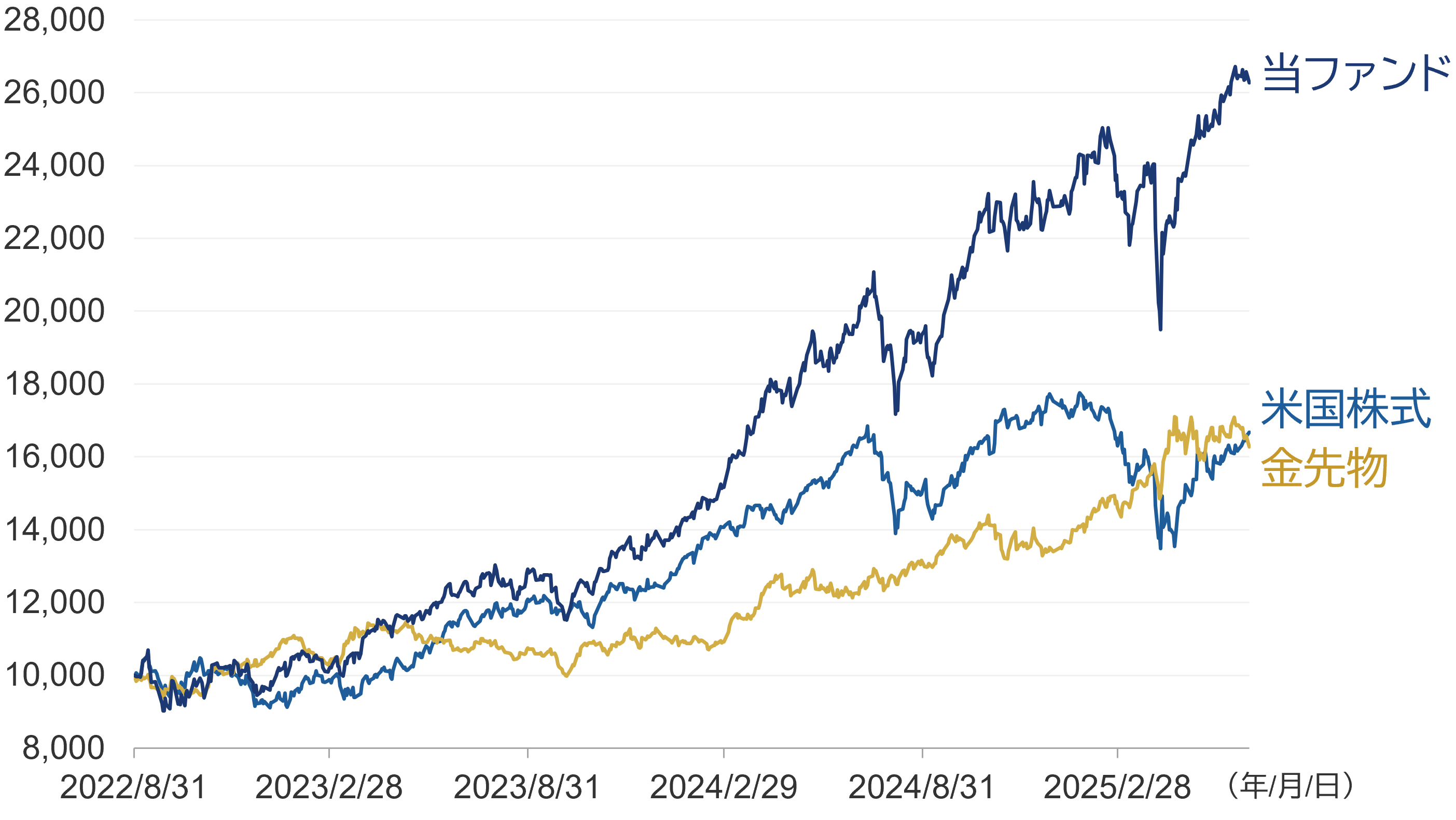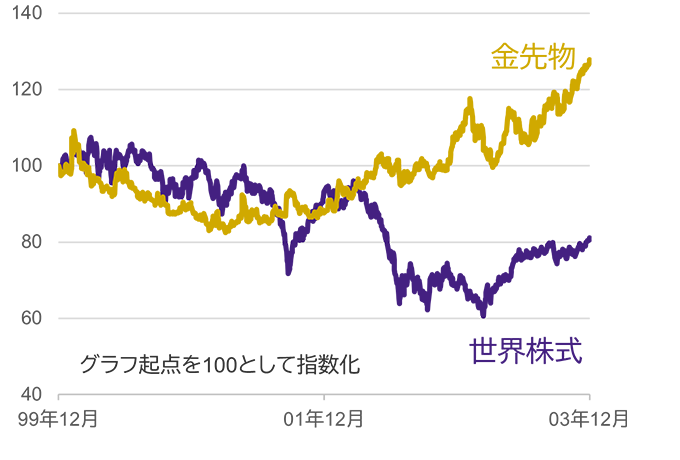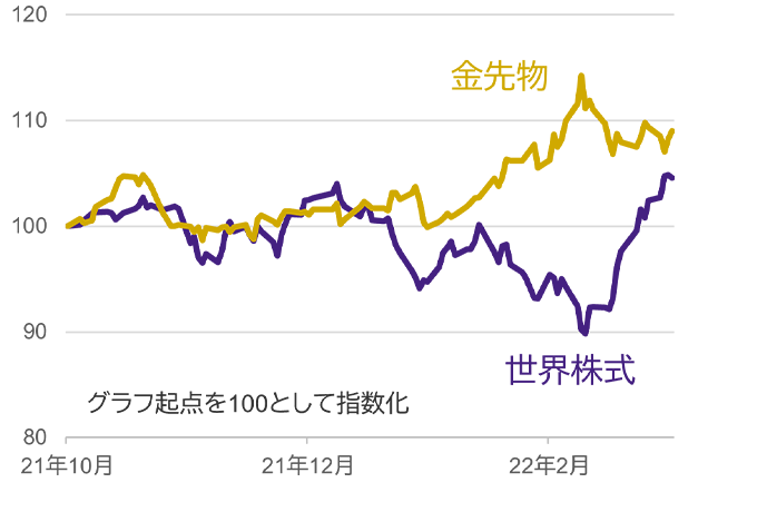世界株式:MSCIオール・カントリー・ワールド・インデックス(税引後配当込み、米ドルベース)の値をアモーヴァ・アセットマネジメントが円換算、金先物:ブルームバーグ金サブ指数(エクセスリターンベース、米ドルベース)。上記指数は、当ファンドのベンチマークではありません。信頼できると判断した情報をもとにアモーヴァ・アセットマネジメントが作成。上記は過去のものであり、将来の運用成果等を約束するものではありません。