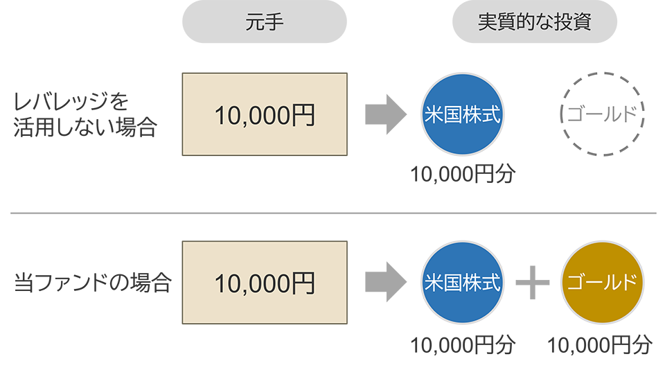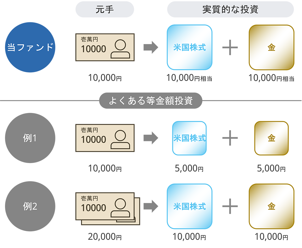 当ファンドは、1万円の投資で、世界株式と金に1万円相当ずつ投資した場合と同様の成果が期待できる というコンセプトの投資信託です。